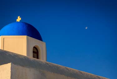 Much more importantly than what I think of this photograph of a Santorini blue domed church roof is what do you all think of this photo, taken not long after sunrise with the moon visible?
